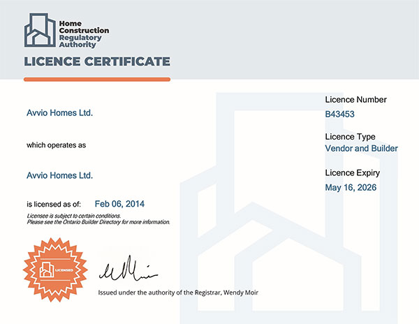 Building a custom home is one of the most significant investments (in time and money) you will make in your lifetime. So it’s critical you choose a builder you can trust. A builder who has a Home Construction Regulatory Authority (HCRA) Licence (ours is #43453) and Warranty backed by the Tarion Warranty Corporation.